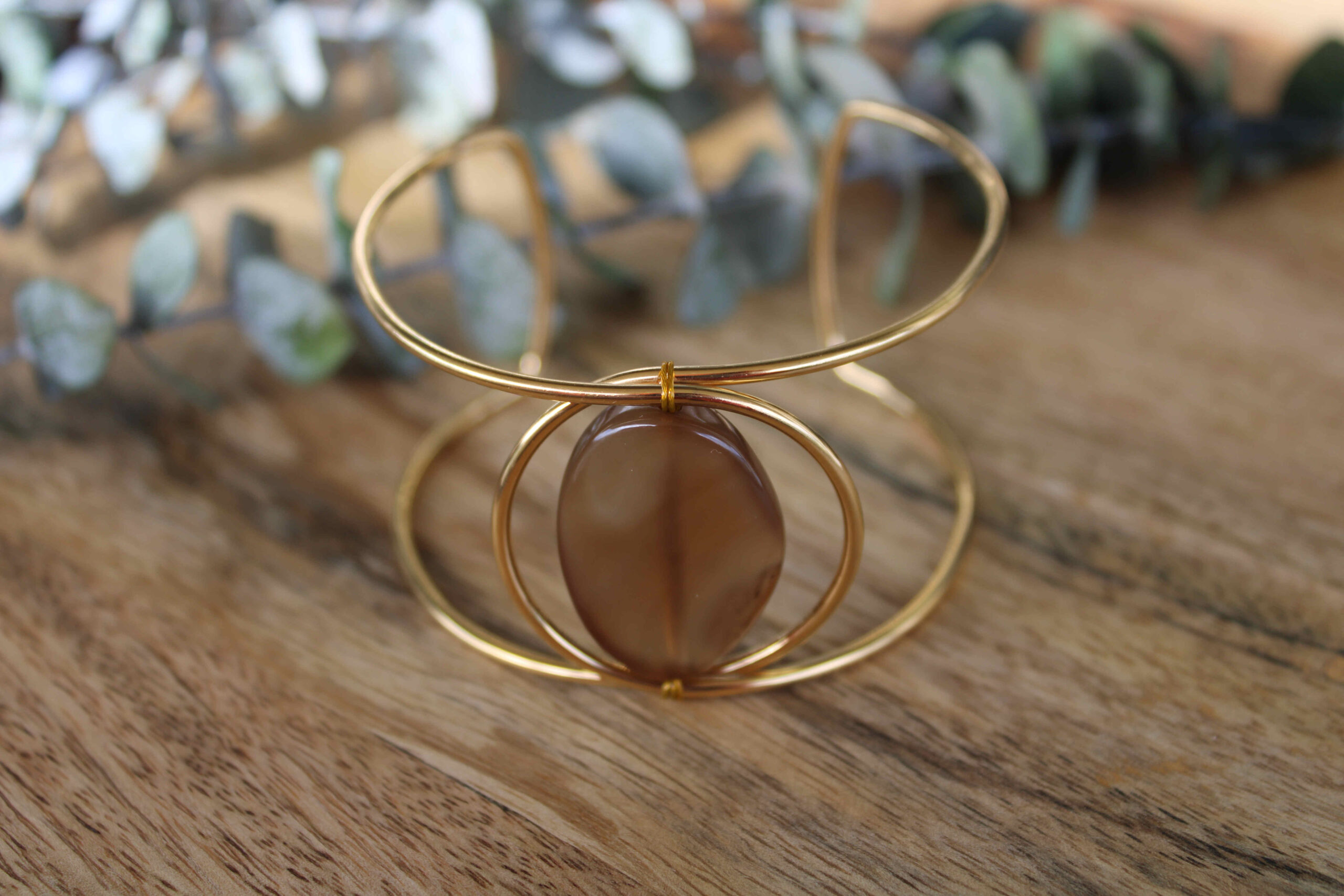 Brazalete rígido abierto de acero dorado con piedra central de ágata.