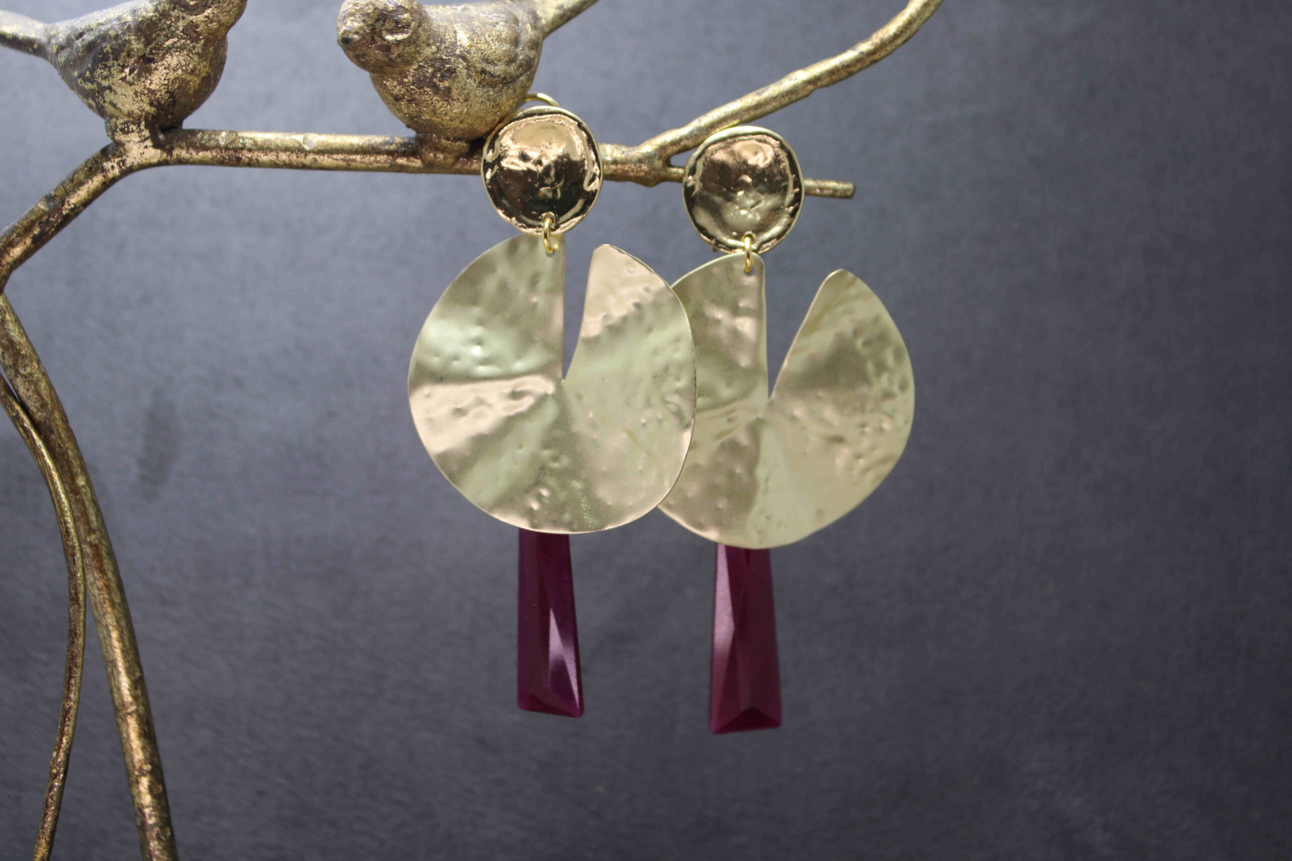Pendientes con perno de zamak con cierre omega, entrepieza con forma original de latón mate y colgante en jade teñido granate.