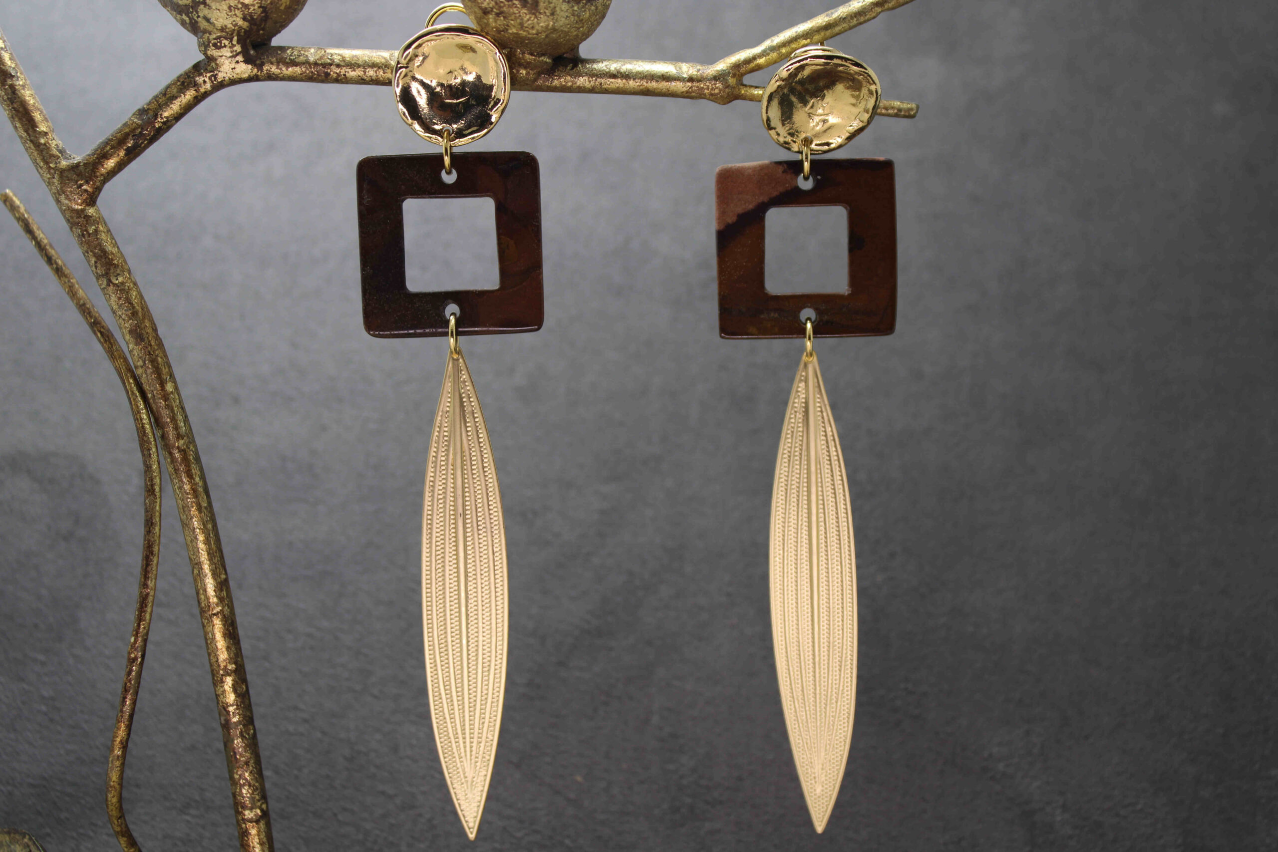 Pendiente con perno de cierre omega realizado en zamak dorado, cuadrado de jaspe marrón y colgante en forma alargada de latón mate.