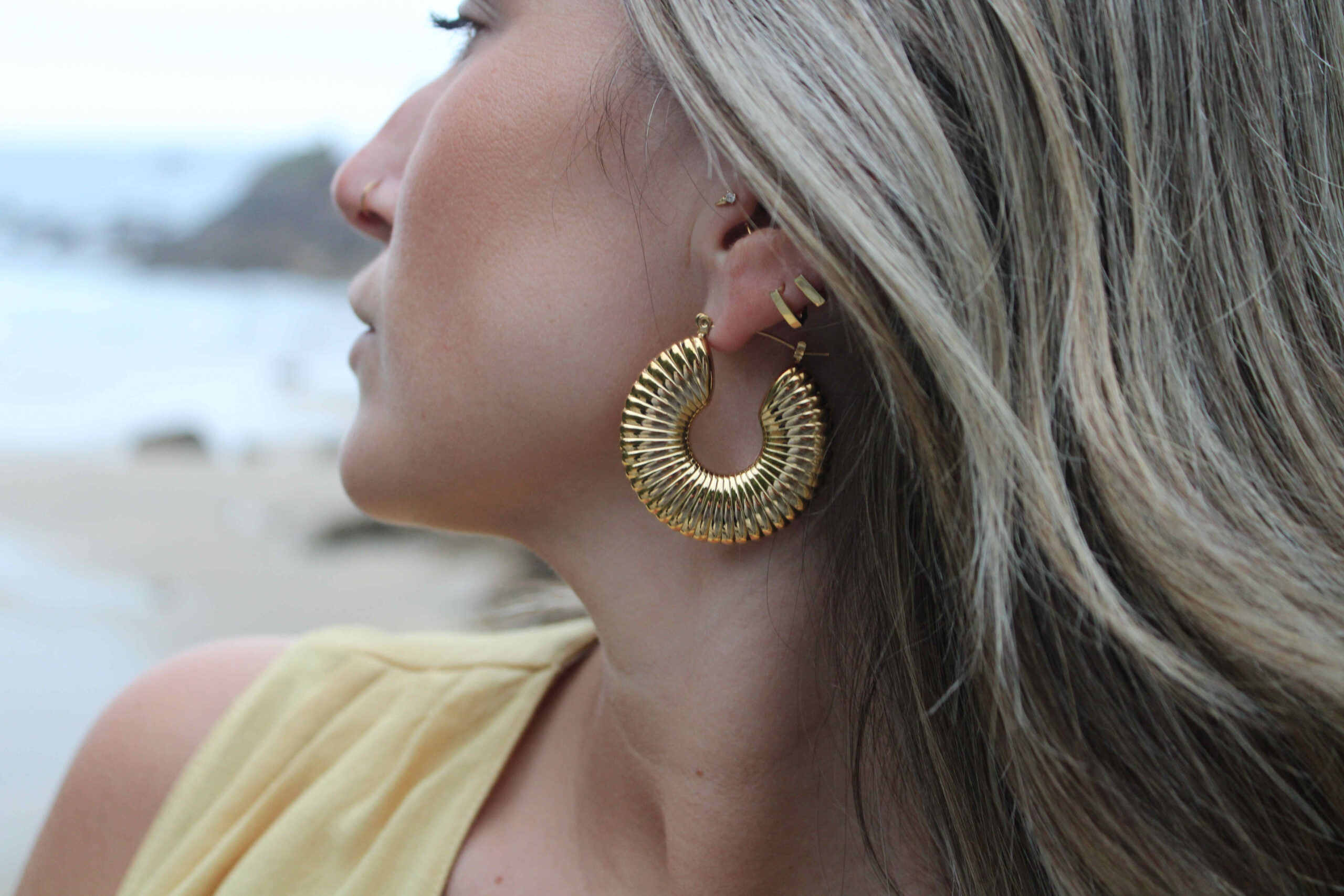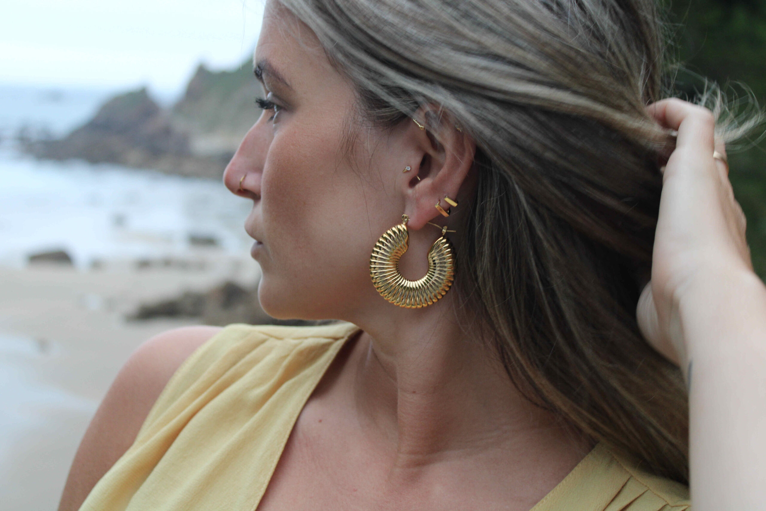 Los pendientes de aro en color dorado se han establecido como una tendencia, acompañando diferentes estilismos de moda ya que encajan con todo tipo de prendas y ocasiones.